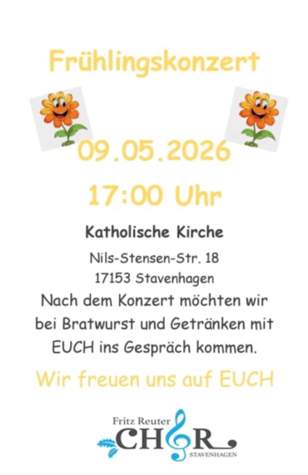 Der Reuterchor aus Stavenhagen lädt am Samstag, dem 09.05.2026, um 17 Uhr zu einem Frühlingskonzert in die St. Paulus-Kirche nach Stavenhagen ein.